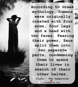 I find this story very romantic.  For those of us who believe in soulmates and two halves making a whole, this allegory would seem to confirm our thoughts.  I found it buried in a self-help relationship book that someone had recommended to me.  I felt better instantly because I always had an indescribable feeling my whole life that something was missing.  As if I were limping through life with only one leg. For fear of sounding dramatic, the book, and Plato’s allegory, changed my way of thinking about life and the universe.  We waste too much time searching for the wrong things and not realizing that it is us who hinder our own progress.   I hope you enjoyed this. Christine Bolton Word of the day Challenge: Moiety Follow Poetry For Healing on WordPress.com (function(d){var f = d.getElementsByTagName(‘SCRIPT’)[0], p = d.createElement(‘SCRIPT’);p.type = ‘text/javascript’;p.async = true;p.src = ‘//widgets.wp.com/platform.js’;f.parentNode.insertBefore(p,f);}(